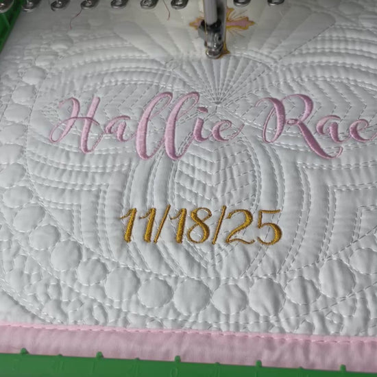 The name and date are usually embroidered in the color that matches the border of the quilt - but if you would like to change the thread color, please describe the color you would like in as much detail as possible and I will text you photos of spools of thread options.