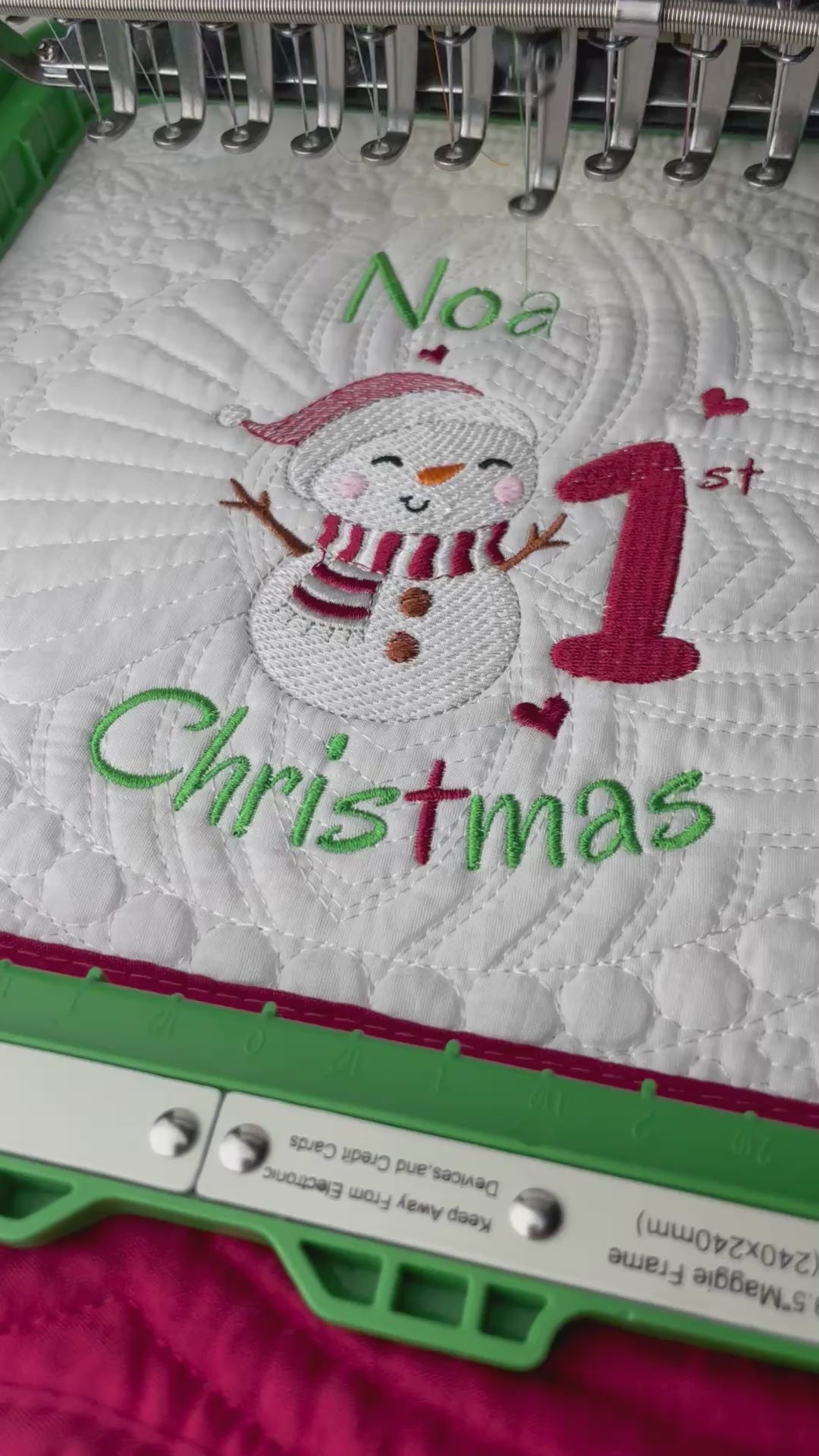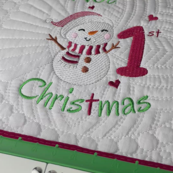 Personalized 1st Christmas Heirloom Quilt Blankets - Custom Embroidered with Name & Snowman. 6 Border Color Options. Christmas, Birthday or Shower Gift.