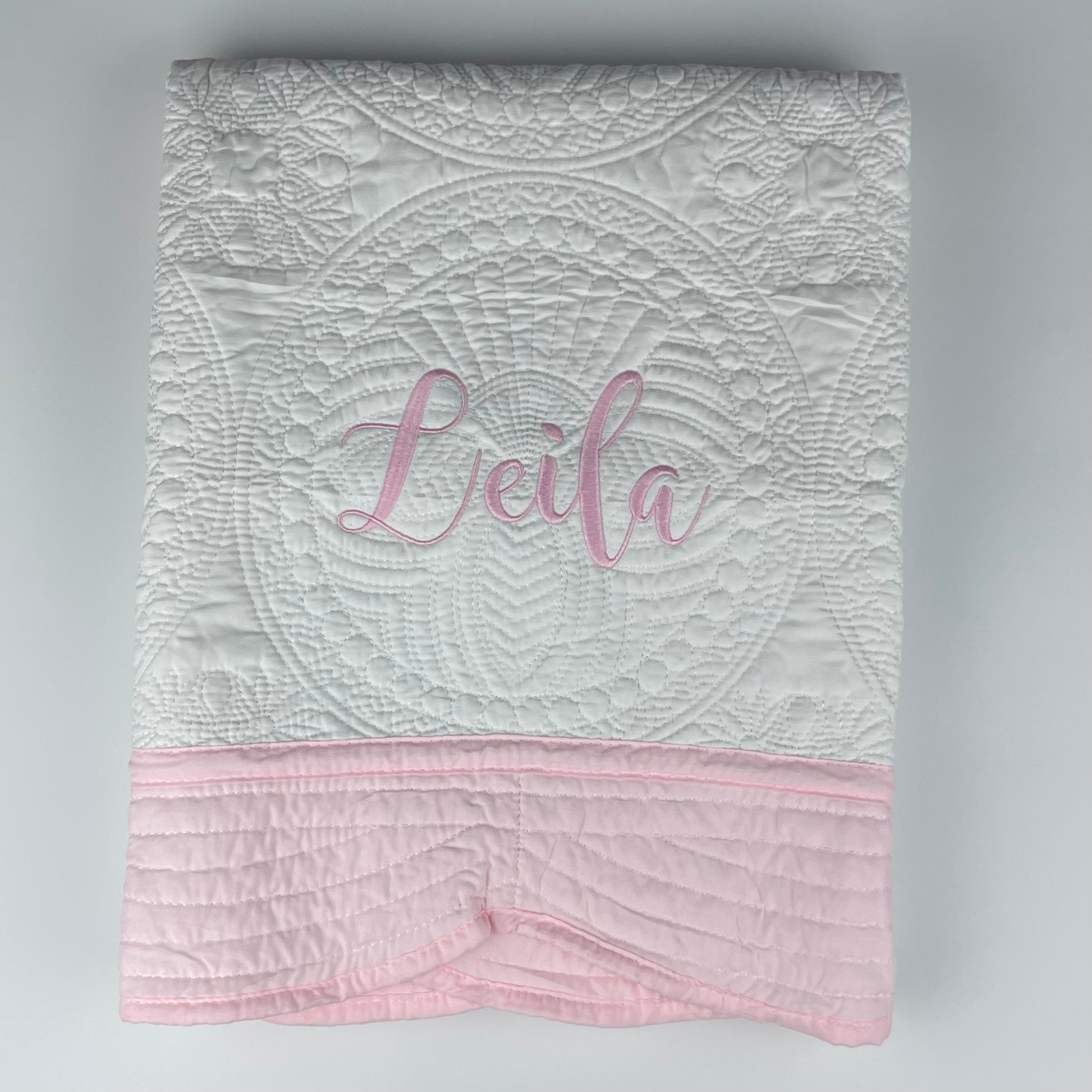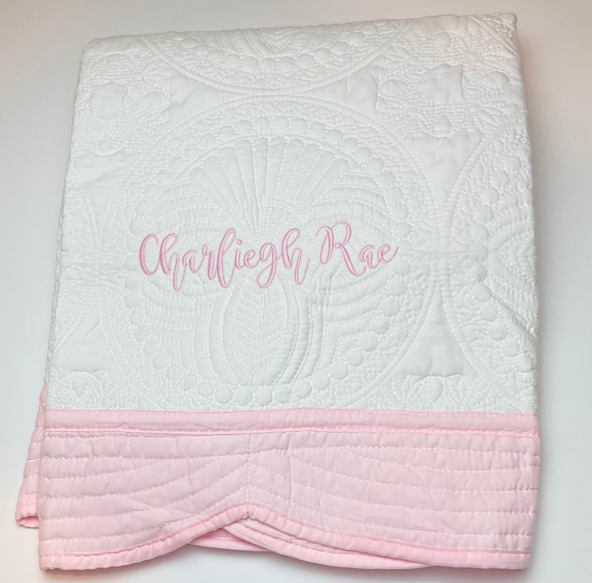 Personalized Baby Heirloom Quilt - Custom Embroidered with Name in your choice of thread color. 6 Border options: Pink, Blue, Green, Purple, Red & White