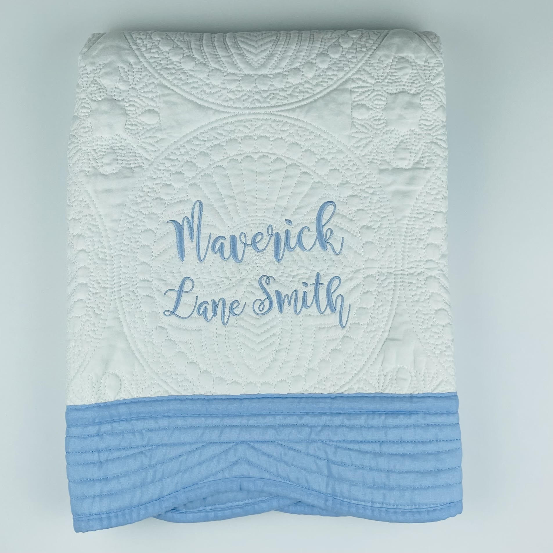 These beautiful heirloom keepsake blankets are embroidered one at a time with love and will be treasured for years to come. Each one is customized uniquely for you with your choice of border color, thread color and name.