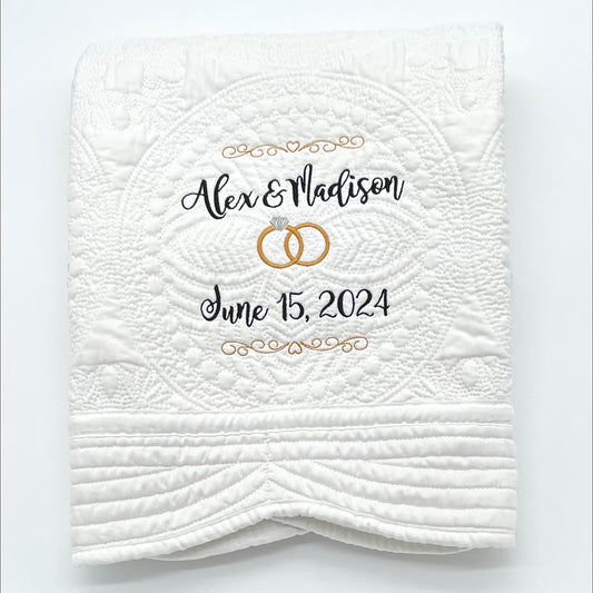 Personalized Wedding Heirloom Quilt Blankets - Custom embroidered with names, date and wedding rings. 6 Border color options. The perfect wedding, anniversary, engagement or shower gift!