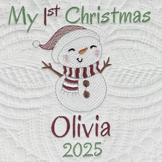 Personalized 1st Christmas Heirloom Quilt Blankets - Custom Embroidered with Name & Snowman. 6 Border Color Options. Christmas, Birthday or Shower Gift.