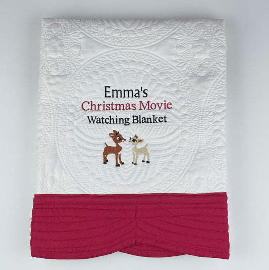 Personalized Christmas Movie Watching Blanket, Quilted Cotton Throw, White with Red Trim (Plus 5 More Border Color Options) Custom Embroidered Name with Choice of Reindeer, Snowman or Gingerbread Man